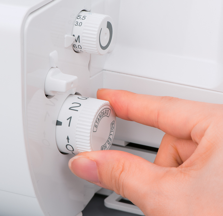 Délku stehu vašeho stroje Ovation snadno nastavíte jedním ovladačem. Tento ovladač také obsahuje nastavení pro automatický rolovaný lem, kterým se vysune vestavěný stehový prst pro zakončování rolovaným lemem.