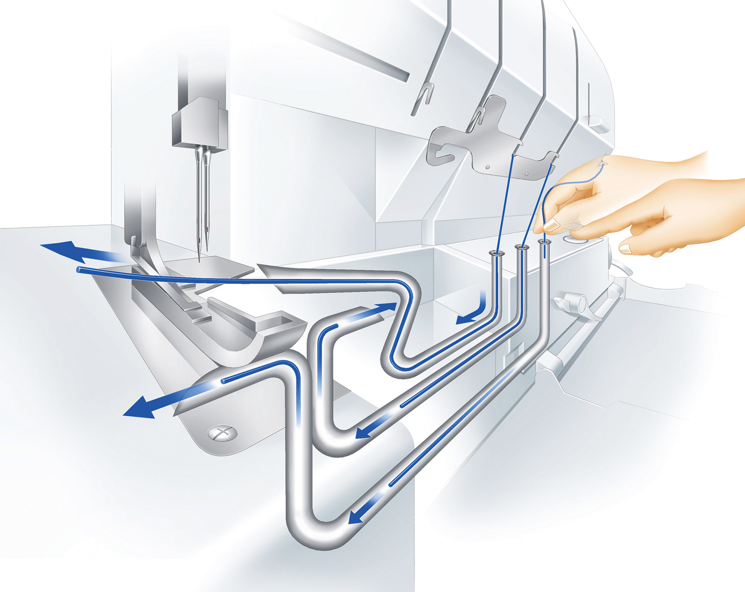 Zasuňte konec nitě do jednoho z navlékacích portů stroje Ovation, stiskněte tlačítko a prudký závan větru okamžitě protlačí niť skrz patentované trubicové smyčkovače přesně tam, kde ji chcete mít. Zamotané, zauzlované a přetrhané nitě jsou již minulostí! Již žádné navlékání nití v přesném pořadí do jednotlivých různě barevných vodičů. Současně můžete navléknout nitě do tří smyčkovačů.