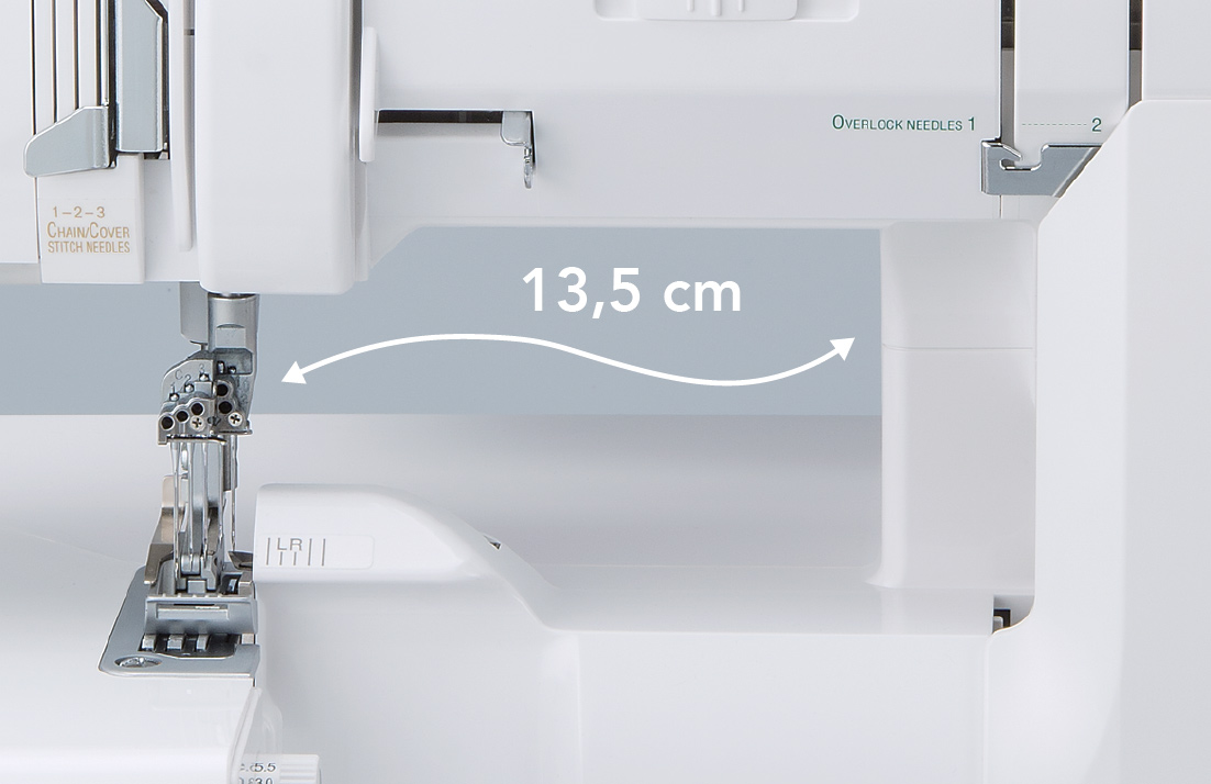 Dostatek místa pro pohodové šití rozměrných projektů. Šití ozdobných stehů na metrech a metrech látek Vás bude fakt bavit. Ovation nabízí pracovní prostor pro vaše šití 13,5 cm vpravo od jehly a 7,8 cm do výšky.