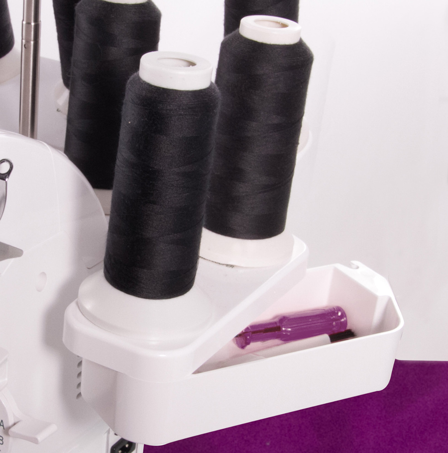 Stojan na cívky pro nitě obsahuje velký úložný prostor pro příslušenství.