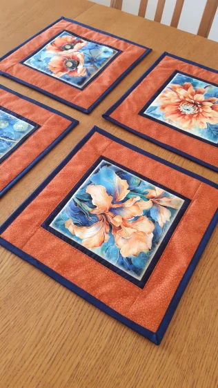 Prostírání s motivy oranžovo modré květy Materiál 100% bavlna z dovozu. Modré olemování prostírek vel. 30 x 30 cm Prostítání je ušité technikou patchwork, má 3 vrstvy. Výztuha termolín Soft 100% Pes