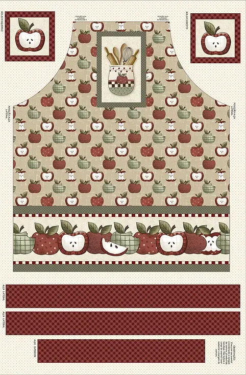 Předtištěná zástěra s různými vzory. Doporučujeme vzít na podšití látku ze stejné kolekce. Zástěra může být oboustranná. Cena 1 bm je 380kč.