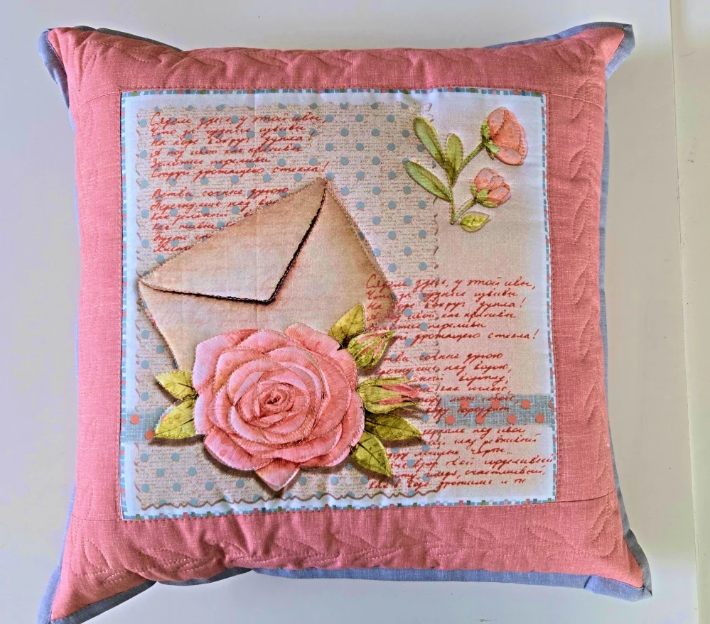 Povlak na polštářek vel. 42 x 42 cm ušitý technikou patchwork  V kombinaci panel a starorůžová lněná půda.  Zadní strana polštářku je starorůžová s aplikací srdíčko s uzávěrem. Olemován je šedou paspulkou. Prošitý ozdobným stehem.